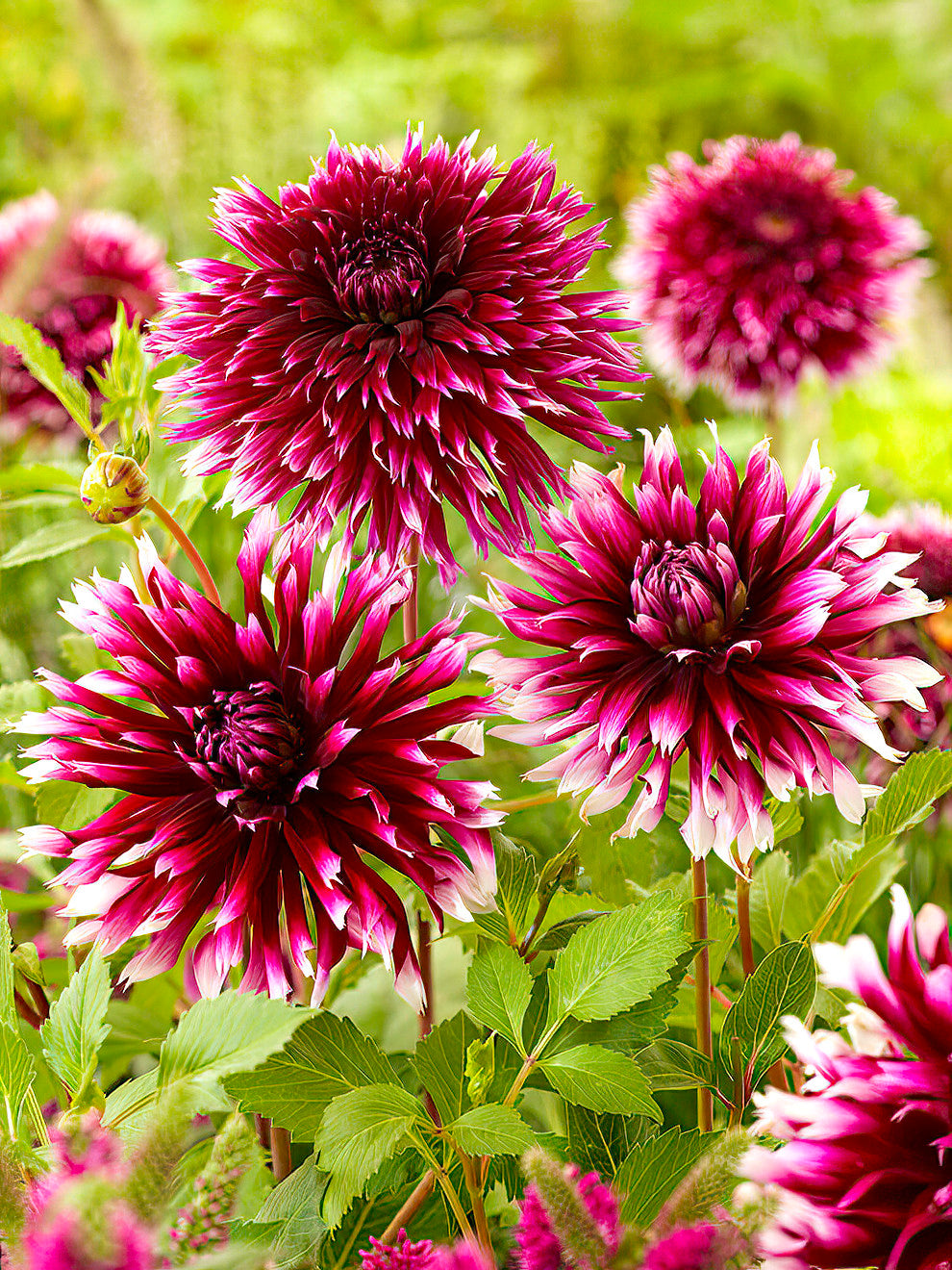 Dahlia Alauna Clair-Obscur is a striking Cactus (Fringed) dahlia known for its dramatic two-tone blooms. The petals start deep burgundy-purple at the center, fading to violet, and finishing with pure white fringed tips, creating a captivating ombré effect. Each flower measures 6-8 inches across, with plants reaching 32-36 inches tall. Perfect for full sun and well-drained soil, it blooms from midsummer through early fall. Ideal for garden borders, containers, or as a cut flower, 'Alauna Clair-Obscur' adds bold color and texture to any landscape. Plant spring tubers after the last frost, spacing 12-18 inches apart. Regular deadheading encourages continuous blooms throughout the season.