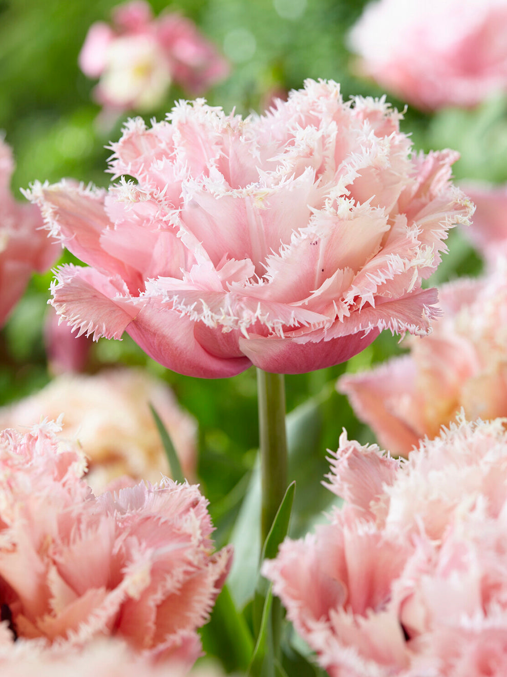 Double Fringed Tulip Pink Magic is the kind of tulip people walk back to for a second look. It blooms like a peony, packed with petals, then finishes each petal edge with a fine fringe that catches the light. Up close it looks almost frosted. The color is the real show. Think soft blush pink with a warm creamy glow in the center, then a slightly deeper pink toward the edges. In cool spring weather it stays fresh and airy. In brighter sun it turns richer and more romantic. Every bloom has that same dreamy palette, but each one has its own little swirl of tone, which is exactly what makes it feel special.