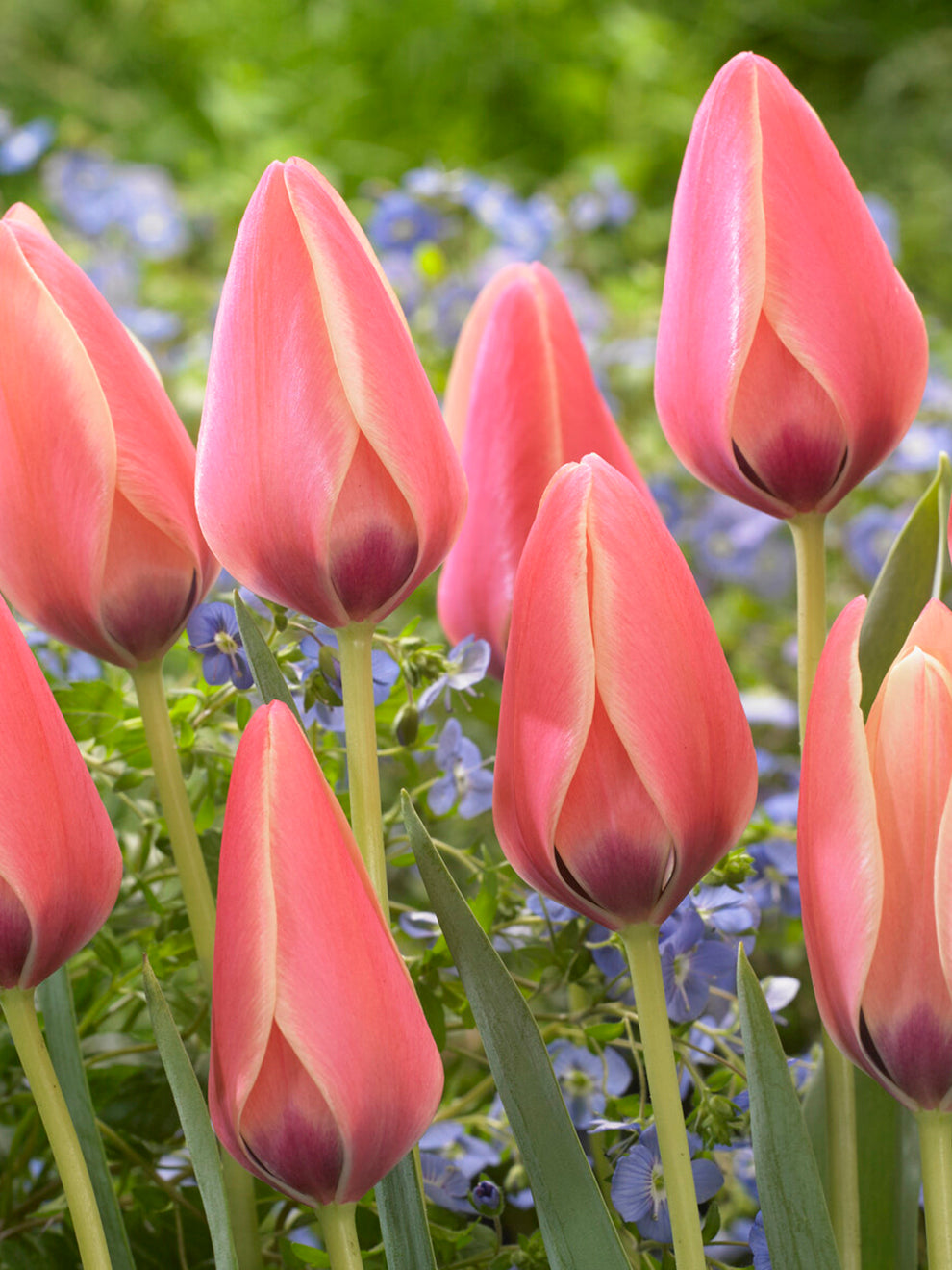 Tulip Annika is a small tulip with a lot of character. Each flower opens in soft salmon pink and ivory, then deepens to warm fuchsia as it matures. At the heart of the bloom sits a rich purple to almost black center, which really shows when the petals open wide in the sun and gives each flower a clear star pattern. Tulip Annika belongs to the species group of Tulipa clusiana, often called lady tulips. Every bulb sends up several slender stems, with three to five flowers on each one, so even a small planting looks busy with color.  The plants stay compact, usually around six to eight inches tall in the garden, which makes them ideal for the front of a border, a rock garden, or a pot on the patio. For gardeners in the United States, Tulip Annika is a very easy keeper. Like other clusiana types it is long lived and happy to naturalize, especially in well drained soil that dries out in summer. It flowers early, often in April, and is hardy in roughly zones four to nine, so it will thrive in much of the country from cooler northern states to many parts of the South and West where larger tulips struggle. Bees are drawn to the open star shaped blooms on bright days, while deer usually leave species tulips alone, which makes Annika a good choice for more natural settings. Plant Tulip Annika bulbs in fall in a sunny spot with light soil, tucking them a few inches deep and fairly close together so the little cups make a solid sheet of color. Once settled, the bulbs return year after year, sending up their soft pink flowers at the very start of tulip season and giving the garden an easy, natural look that feels more like a wildflower drift than a formal display.